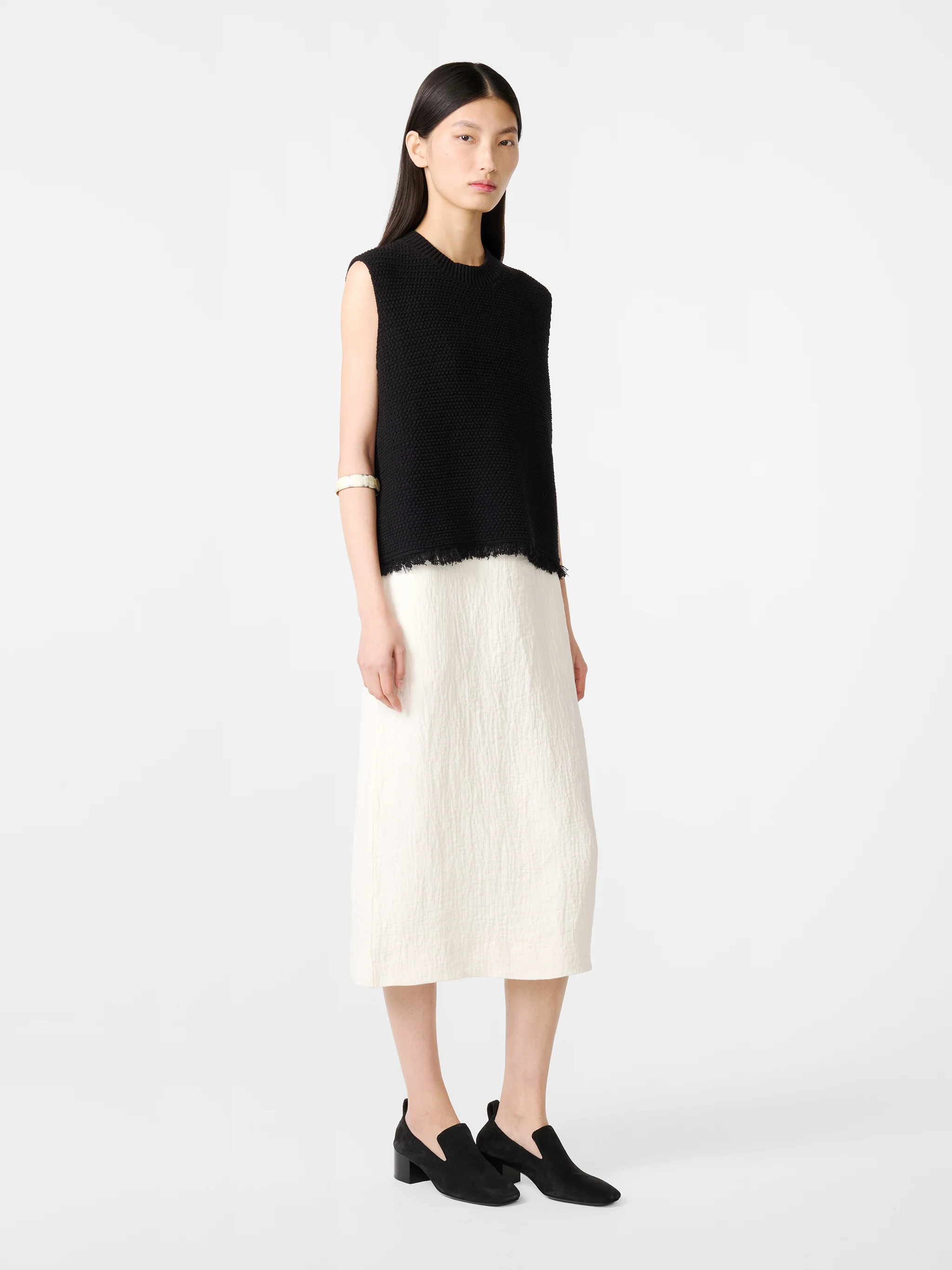 Studio Nicholson reimagines the enduring vest silhouette – a mainstay of any warm-weather wardrobe – with this Fray iteration. It’s knitted from slub cotton bouclé yarns to give a textured hand feel, then shaped with a ribbed neckline and a finished with a fringed hem, further accentuating the textural mood.