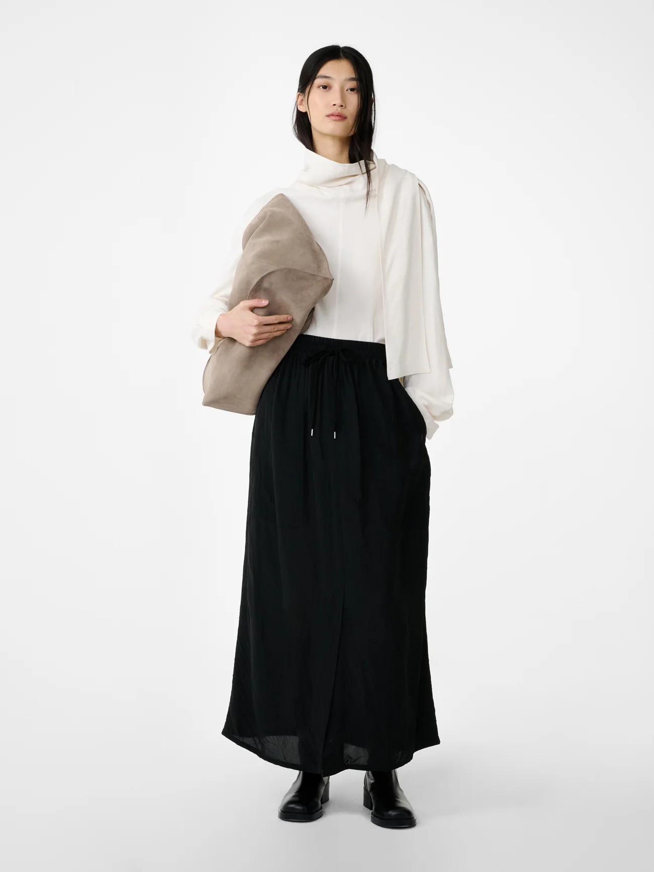 An update on a pared-back black maxi skirt, Oates is cut from our crushed viscose: an Italian-milled material with a creased, irregular finish that drapes effortlessly and chosen here to amplify the fluid, A-line frame. Constructed with an elasticated waistband with drawstrings and a front vent, this easy-to-wear skirt is fitted with generous Italian patch pockets that recall our longstanding workwear influences.