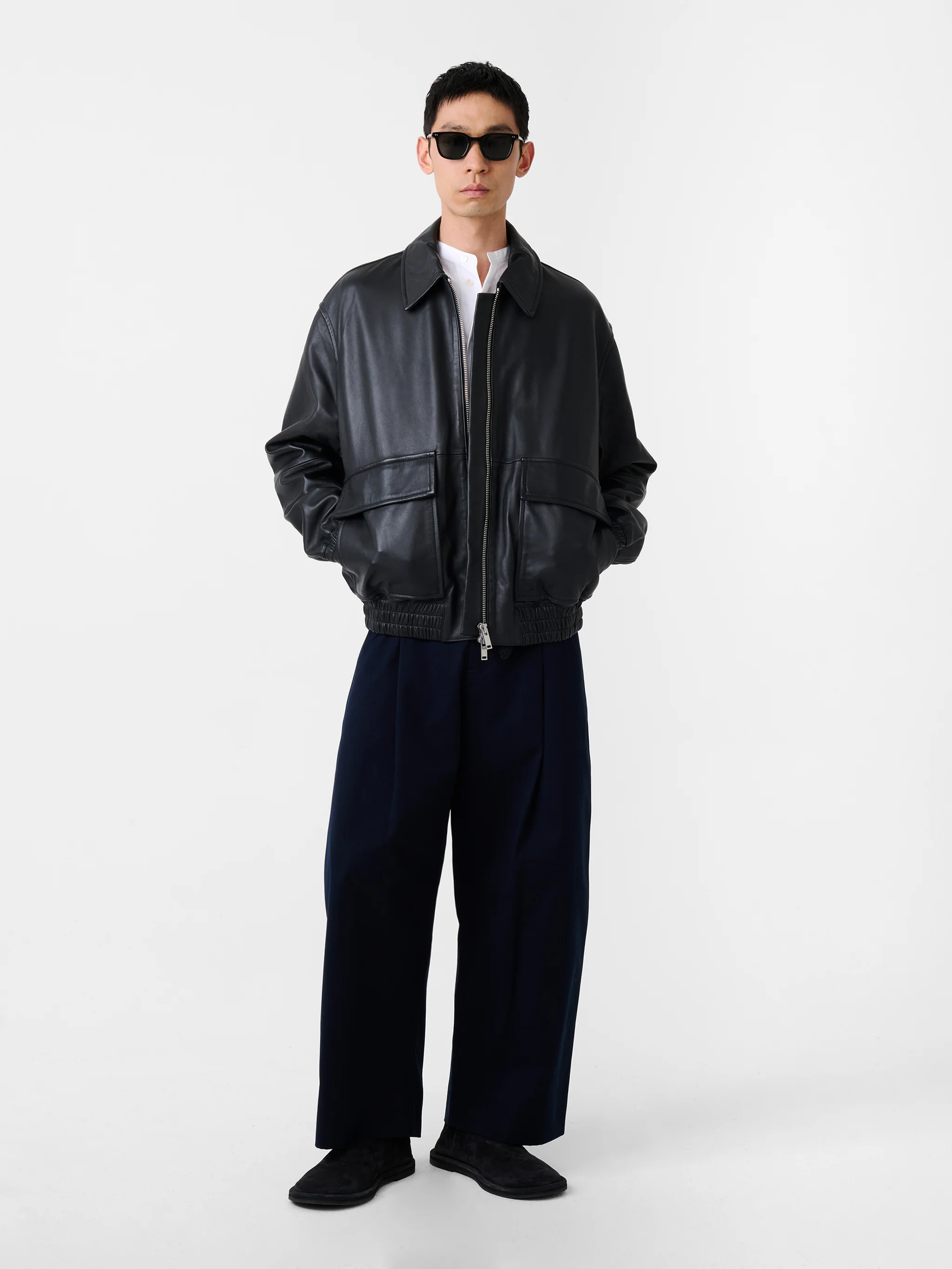 Crafted from buttery soft lamb leather, this unisex designer jacket blends heritage aviation references with Studio Nicholson’s pared-back design language. The relaxed blouson shape, clean lines and subtle volume create a sculptural profile suited to everyday wear. The supple leather offers natural movement and a refined drape that settles beautifully over time. For alternative silhouettes and complementary outerwear, see the rest of the outerwear collection.