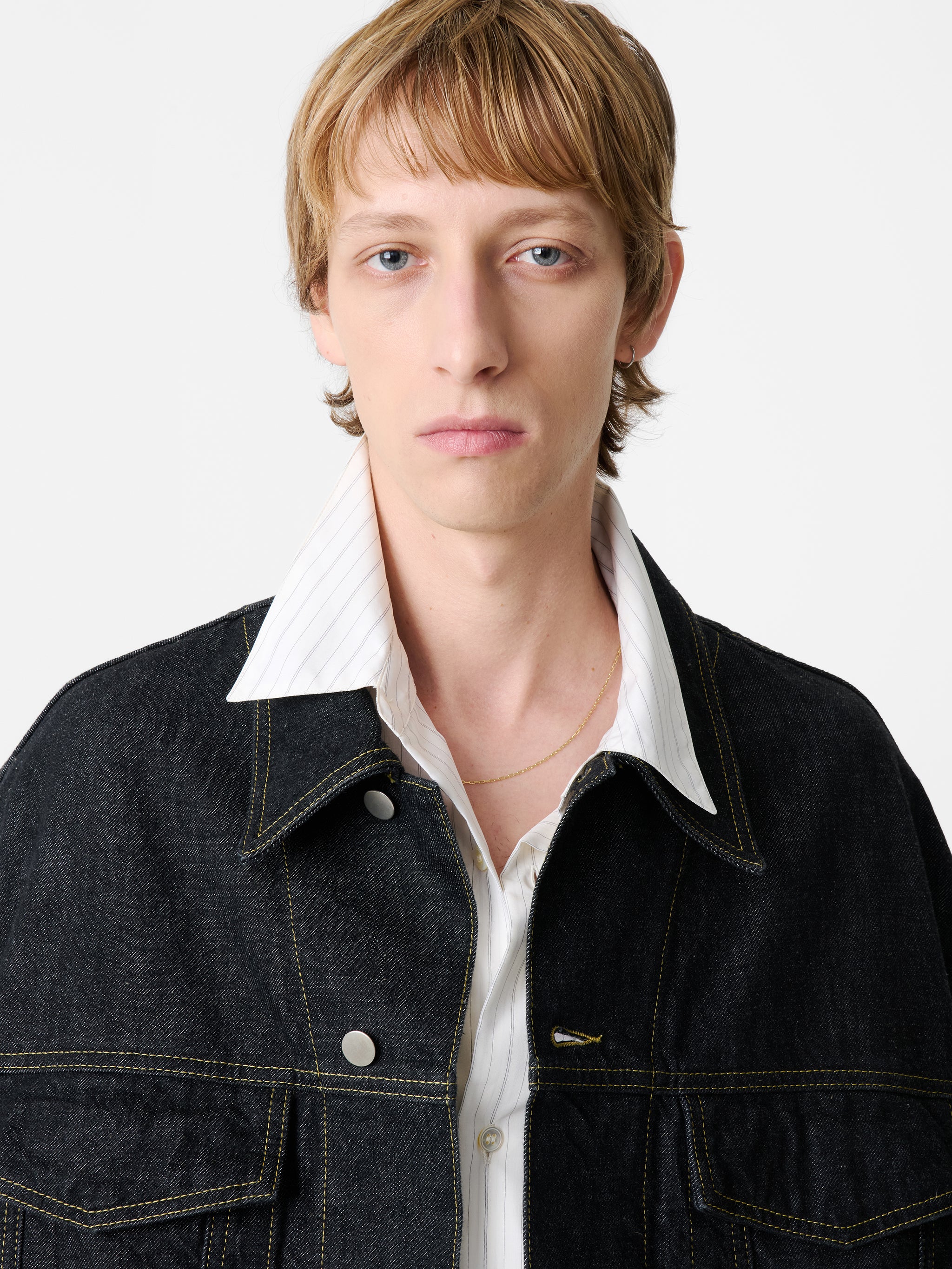 The Stein reinterprets the classic denim jacket for a modern wearer, relaxing the silhouette with slightly dropped shoulders, large front flap pockets, and a boxy fit. It has been constructed in a 13oz Italian denim with a strong salt and pepper grain and tobacco thread at the seams.